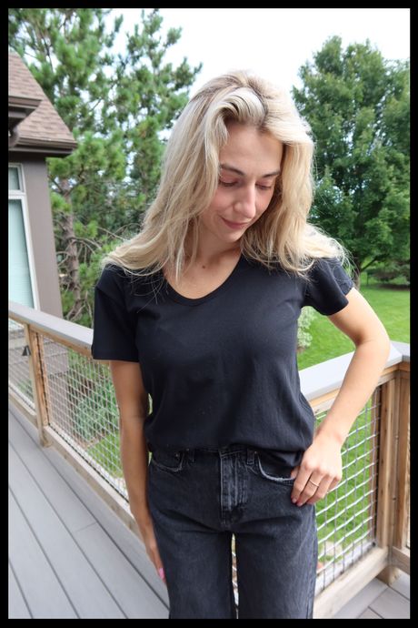 Cozy Earth is known for its luxuriously soft bedding and sweaty-sleeper-approved pajamas, but the brand also has some incredible basics thanks to the recent launch of its All Day Collection. I tested the All Day Tee, which is made from 50 percent Pima cotton, an extra-long staple cotton that’s naturally breathable, and loved how the mid-weight fabric is soft and comfortable even on sweltering hot summer days. The cut is slightly boxy but since it’s more of a relaxed fit, this tee doesn’t cling to your midsection. The hem hits right below the waist, and the sleeves end about halfway down my biceps. Though the price tag is on the higher end, the All Day Tee is one of the sturdier and more structured options on this list, so I think it will hold up better over time.
